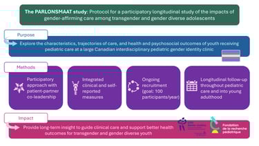 Tout en incluant des éléments novateurs, tels l'inclusion des données auto-rapportées et des données cliniques, ainsi qu'une approche participative, PARLONS-MAAT sera la plus grande étude longitudinale canadienne à suivre des jeunes trans et de la diversité de genre à travers leurs parcours médicaux. Ces jeunes seront également suivi·es à l'âge adulte pour examiner les effets à moyen et à long terme des soins médicaux liés à l'identité de genre.